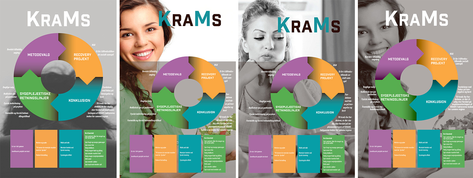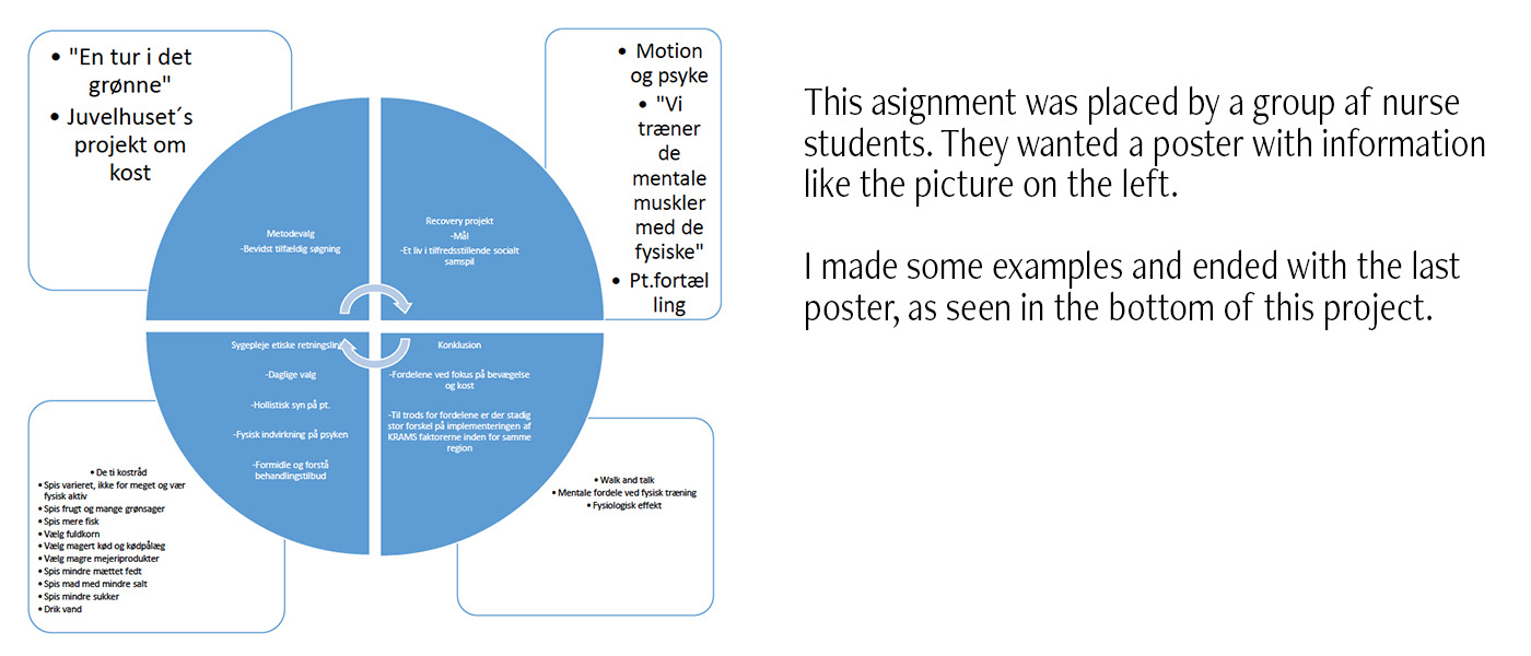 This asignment was placed by a group af nurse students. They wanted a poster with information like the picture on the left. I made some examples and ended with the last poster, as seen in the bottom of this project.