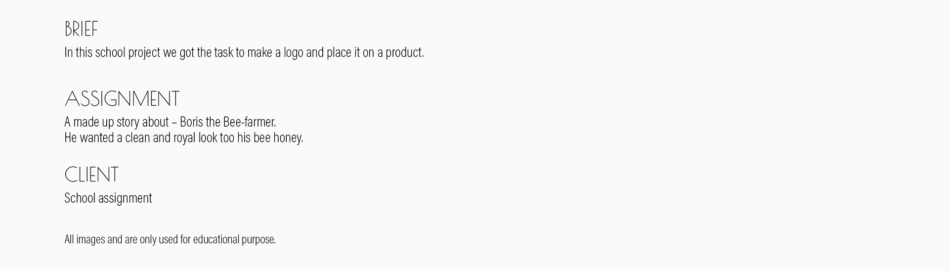 Brief In this school project we got the task to make a logo and place it on a product. Assignment A made up story about – Boris the Bee-farmer. He wanted a clean and royal look too his bee honey. All images and are only used for educational purpose.